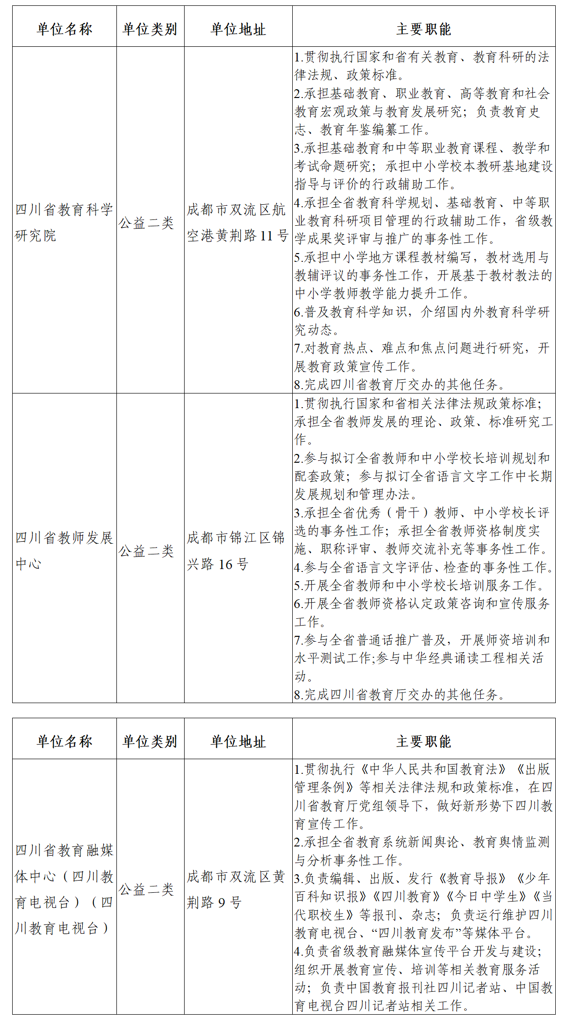 本次招聘均在事业单位经批准设置的岗位内招聘,招聘名额为5名,其中四川省教育科学研究院招聘专业技术岗位1名、四川省教师发展中心招聘专业技术岗位2名、四川省教育融媒体中心(四川教育电视台)招聘专业技术岗位2名,具体岗位和条件见《岗位和条件要求一览表》。