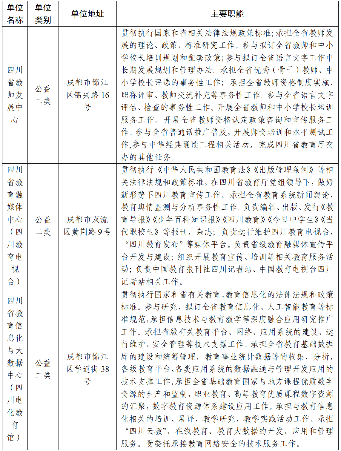 因工作需要,四川省教育厅面向社会公开招聘工作人员补充到四川省教师发展中心、四川省教育融媒体中心(四川教育电视台)、四川省教育信息化与大数据中心(四川省电化教育馆)3个直属事业单位工作,现将公开招聘有关事项公告如下。