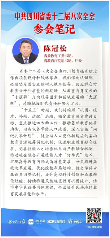 省委十二届八次全会为四川教育强省建设作出顶层设计和战略擘画,我们深刻认识到,必须坚定落实立德树人根本任务,回应群众对教育公平和质量的新期盼,从教育自身发展的“小逻辑”走向服务国家和区域发展的“大逻辑”,清晰把握时代责任和努力方向。